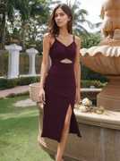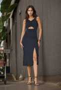 Material: Premium stretchable polyester blend for comfort and fit, Length: Midi, Sleeves: Sleeveless, Neckline: V-neck with ruched bust detail and cut-out design, Closure: Slip-on style, Fit: Bodycon, figure-enhancing, Pattern: Solid black, Slit: Side thigh-high slit for ease of movement and style, Occasion: Party, date night, evening events, cocktails
