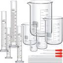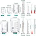 5 beaker sizes include 50 ml, 100 ml, 250 ml, 500 ml, 1000 ml, 4 measuring cylinder sizes include 10 ml, 25 ml, 50 ml, 100 ml, 3 sizes of droppers, 4 stirring rods is 20 cm/ 7.9 inch