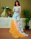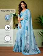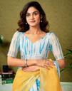 Explore the collection of beautifully designed sarees from Samah Sarees On Flipkart. Saree Fabric : Linen & Blouse Fabric : Linen :: Saree Color : Turmeric Yellow & Blouse Color : White, Blue :: Saree Work :Zari Border, Printed, (Ready To Wear) & Blouse Work : Printed, Zari Border