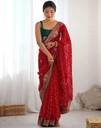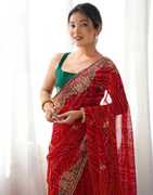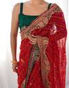 Explore the collection of beautifully designed sarees from Samah Sarees On Samah. Saree Fabric : Georgette & Blouse Fabric : Georgette :: Saree Color : Red & Blouse Color : Dark Green :: Saree Work :Bandhani Printed, Embroidery, Gota Lace & Blouse Work : Embroidery