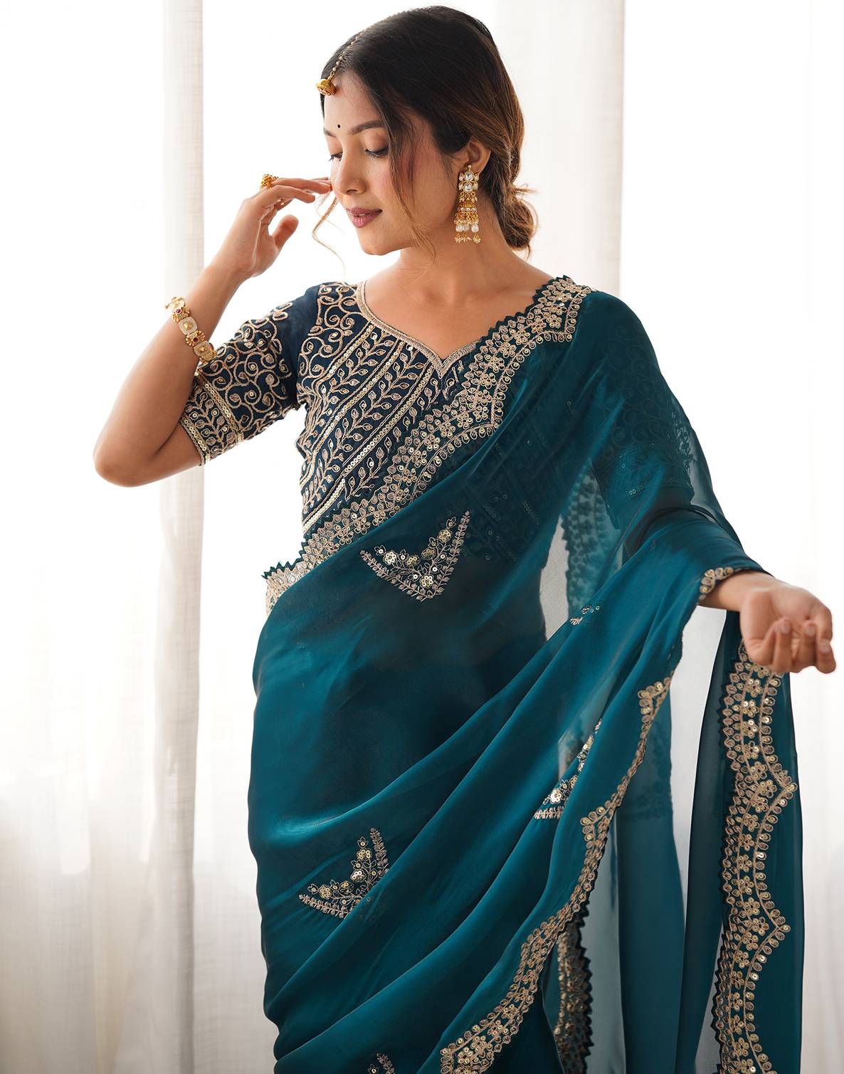 Explore the collection of beautifully designed sarees from Samah Sarees . Saree Fabric : Organza & Blouse Fabric : Bhagalpuri Silk :: Saree Color : Rama Green & Blouse Color : Rama Green :: Saree Work :Dyed, Sequin Embroidery, Scollped Border & Blouse Work : Dyed, Sequin Embroidery