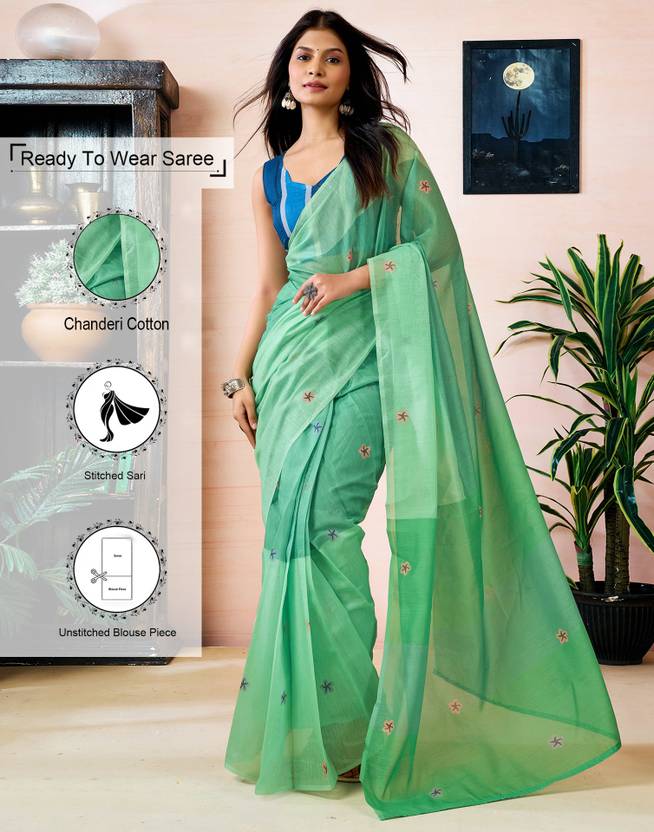 Explore the collection of beautifully designed sarees from Samah Sarees On Flipkart. Saree Fabric : Chanderi Cotton & Blouse Fabric : Chanderi Cotton :: Saree Color : Light Green & Blouse Color : Blue :: Saree Work :Printed (Ready To Wear) & Blouse Work : Printed