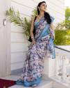 Linen Floral Printed & Zari Border Off White & Blue Ready To Wear Saree