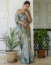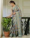 Dola Silk Floral Printed & Woven Zari Stripe Dusty Teal GreenReady To Wear Saree