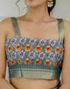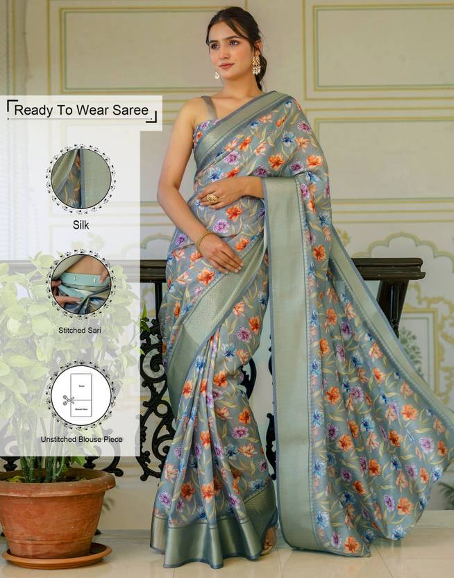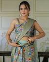 Explore the collection of beautifully designed sarees from Samah Sarees. Saree Fabric : Dola Silk & Blouse Fabric : Dola Silk :: Saree Color : Dusty Teal Green & Blouse Color : Dusty Teal Green, Multi :: Saree Work :Floral Printed, Woven Zari Stripe, Woven Border (Ready To Wear) & Blouse Work : Floral Printed, Woven Zari Stripe, Woven Border