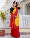 Explore the collection of beautifully designed sarees from Samah Sarees. Saree Fabric : Chinnon & Blouse Fabric : Bhagalpuri Silk :: Saree Color : Yellow, Red & Blouse Color : Black :: Saree Work :Padding Dyed & Blouse Work : Dyed