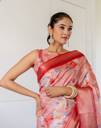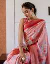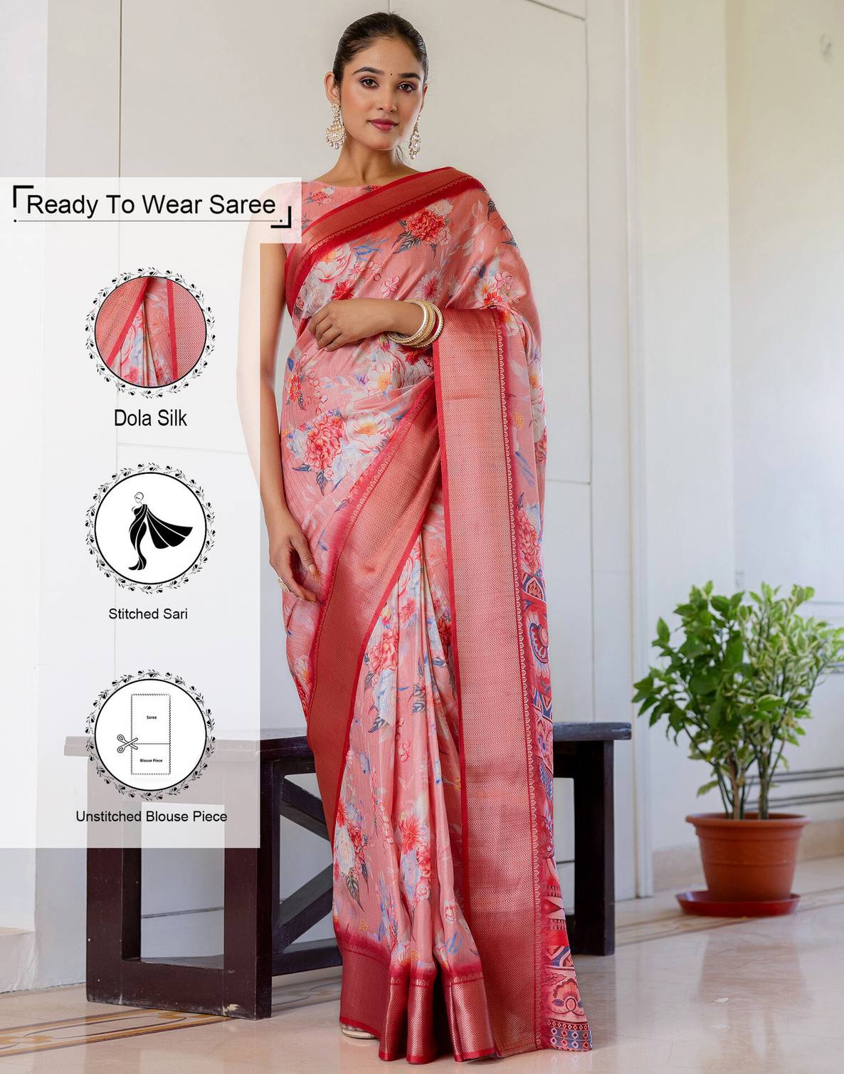 Explore the collection of beautifully designed sarees from Samah Sarees. Saree Fabric : Dola Silk & Blouse Fabric : Dola Silk :: Saree Color : Peach & Blouse Color : Peach, Multi :: Saree Work :Floral Printed, Woven Zari Stripe, Woven Border (Ready To Wear) & Blouse Work : Printed, Woven Zari Stripe, Woven Border