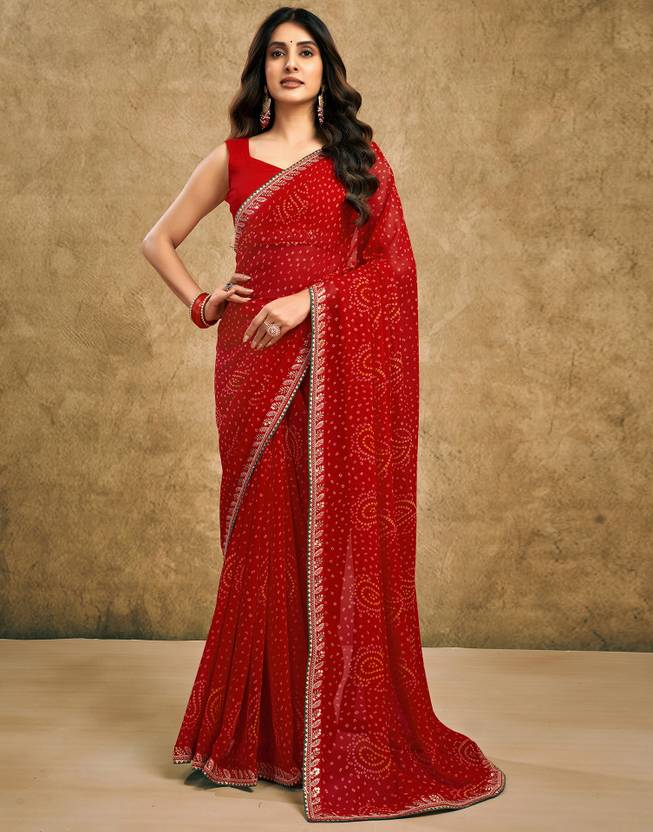 Georgette Bandhani Printed & Lace Red Color Saree With Blouse