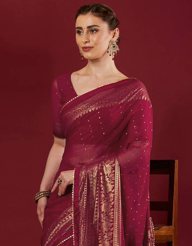 Explore the collection of beautifully designed sarees from Samah Sarees. Saree Fabric : Georgette & Blouse Fabric : Georgette :: Saree Color : Rani Pink & Blouse Color : Rani Pink, Golden :: Saree Work :Foil Printed, Lace, Tassels & Blouse Work : Foil Printed