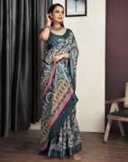 Discover A Stunning Assortment Of Beautifully Crafted Sarees At Samah Sarees On .Saree Fabric : Cotton Blend & Blouse Fabric : Cotton Blend :: Saree Color : Grey, Rama Blue, Multi & Blouse Color : Dark Grey, Black :: Saree Work : Warli Printed, Zari Stripe Border & Blouse Work : Warli Printed, Zari Stripe Border :: Saree Length : 5.30Mtr & 0.80Mtr
