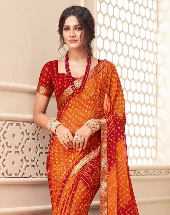Explore the collection of beautifully designed sarees from Samah Sarees On Samah Saree Fabric : Chiffon & Blouse Fabric : Chiffon :: Saree Color : Orange, Red & Blouse Color : Red :: Saree Work :Lace, Tassel, Bandhani Printed & Blouse Work : Lace, Printed
