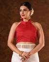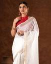 Explore the collection of beautifully designed sarees from Samah Sarees. Saree Fabric : Linen & Blouse Fabric : Bhagalpuri Silk :: Saree Color : White & Blouse Color : Red :: Saree Work :Zari Border & Blouse Work : Dyed
