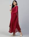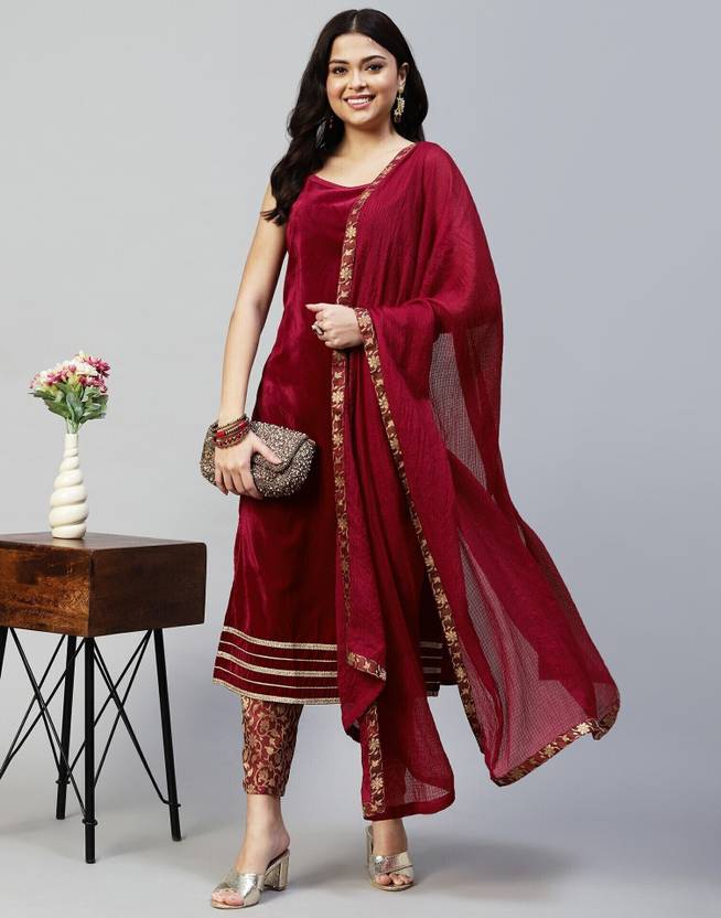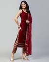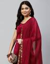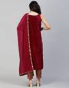 Samah is well known brand of amazing range of women's ethnic wear in soft and solid colors that looks perfect for any occassion.With beautiful designs and patterns our apparels are very stylish and comfortable too.Get rid of the 'regular' look this season wearing this trending ethnic set by Samah.This Calf Length Maroon colored Solid ethnic set will comes with Sleeveless and Round Neck Velvet kurta , Maroon, Gold Brocade bottom and Maroon color Lace, Solid Kota Check dupatta.Kurta Fabric : Velvet , Bottom Fabric : Brocade , Dupatta Fabric : Kota Check :: Kurta Work : Solid , Bottom Work : Self Woven , Dupatta Work : Lace, Solid :: Kurta Color : Maroon , Bottom Color : Maroon, Gold , Duptta Color : Maroon :: Bottom Waist Type : Half Elastic :: Tye : 1 Kurta::1 Pant::1 Dupatta