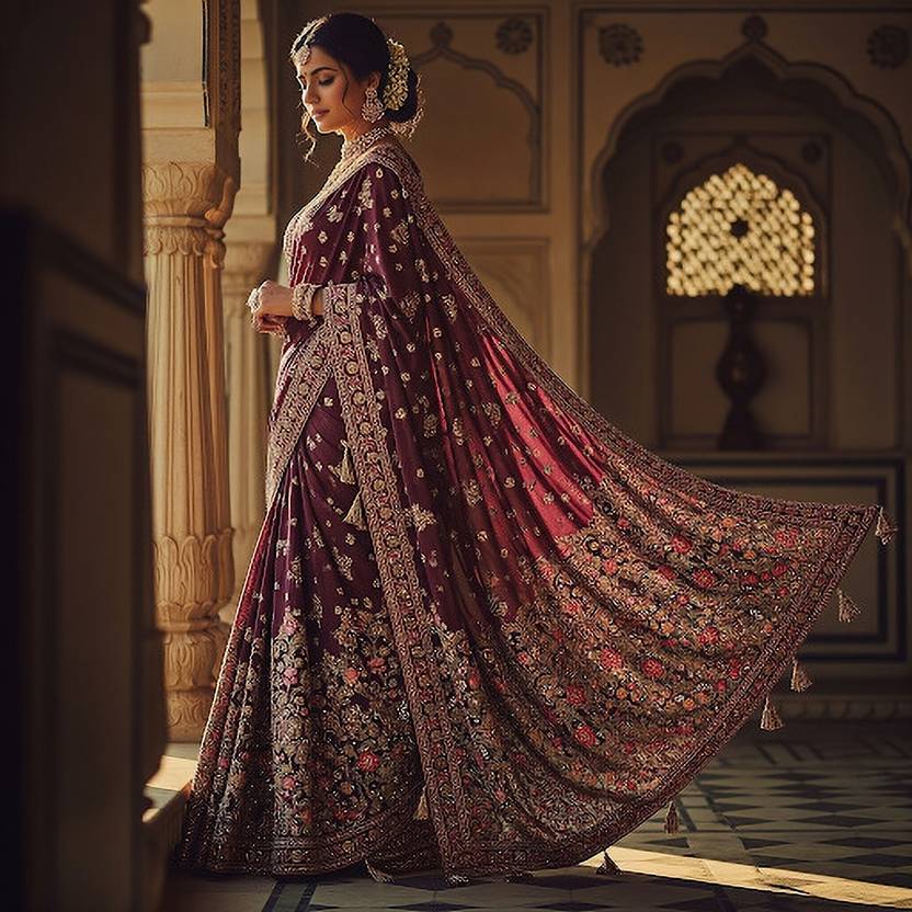 Floral Print, Embroidered Bollywood Chanderi Saree (Maroon)