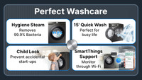 The Child Lock feature in Samsung Front Load Washing Machines keeps your wash cycle safe from accidental interruptions. It locks the control panel and door during operation, ensuring children cannot tamper with settings or open the machine. This smart safety function gives parents peace of mind while delivering a smooth, uninterrupted wash every time.