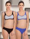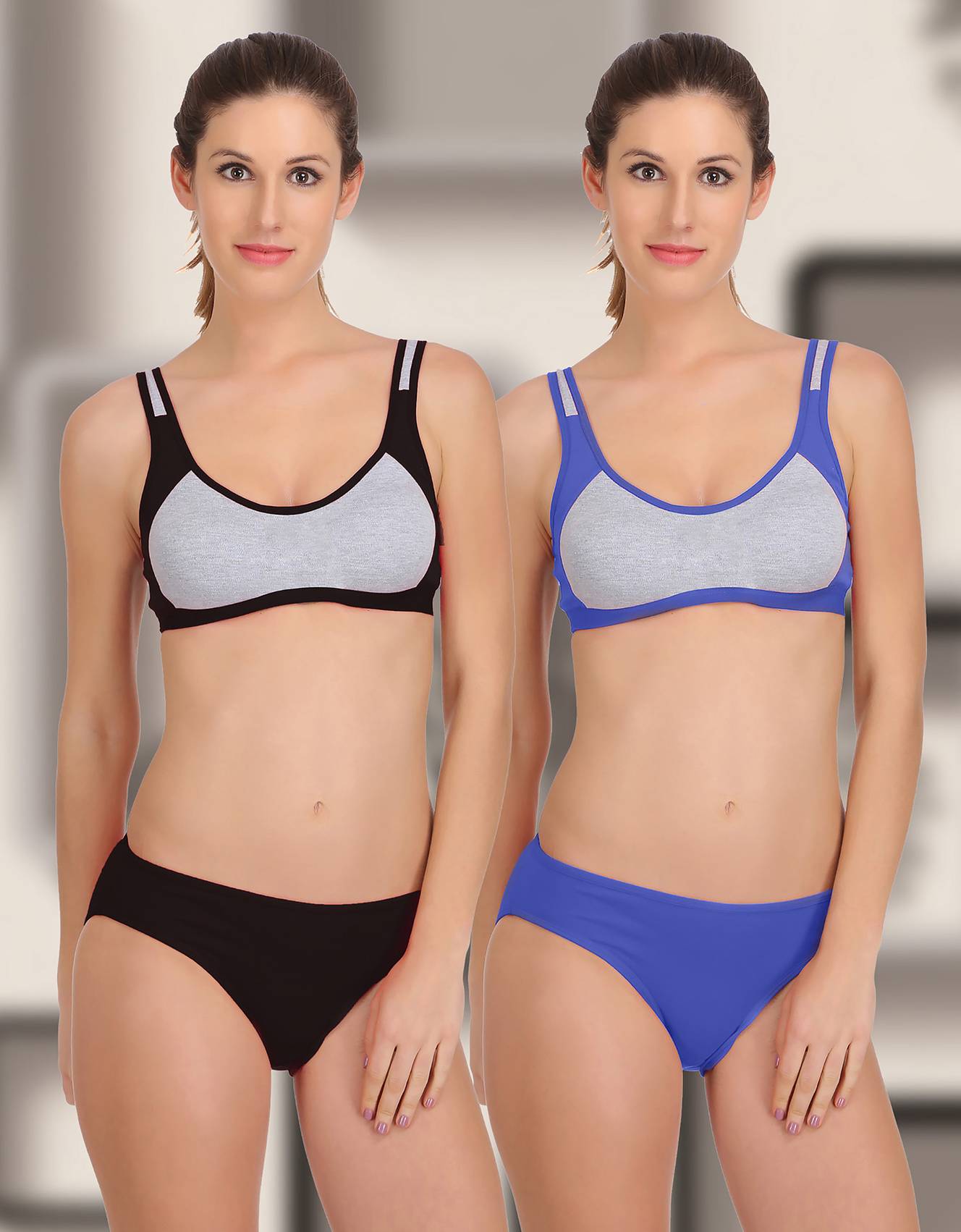 Bra & Panty Set is perfect for exercising, gym,walk ,aerobics or yoga. Soft wide straps , linning for maximum support & comfort .Modern styling with wide arm holes provides complete freedom of movement. It has a high back and full coverage which is perfect gym wear .The Fresh coloured panty has elasticized waist bands and leg hole which is comfortable. Cross back styling with wider armholes. Made of cotton elastin stretch fabric providing superior comfort and stretch. Full figure with an elasticated band that allow you to slip into them with ease and assures a firm fit.