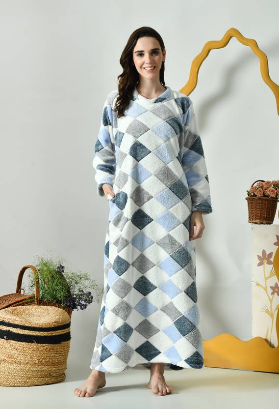 Stay cozy this winter with this woolen diamond print winter nighty, designed for ultimate comfort during chilly nights. Crafted from soft wool-blend fabric, this nightdress provides warmth while remaining breathable and lightweight. The maxi-length design with full sleeves ensures full coverage, while the trendy diamond print pattern adds a fashionable touch. Ideal for women looking for a stylish yet comfortable option for nightwear or lounge wear during the winter season.