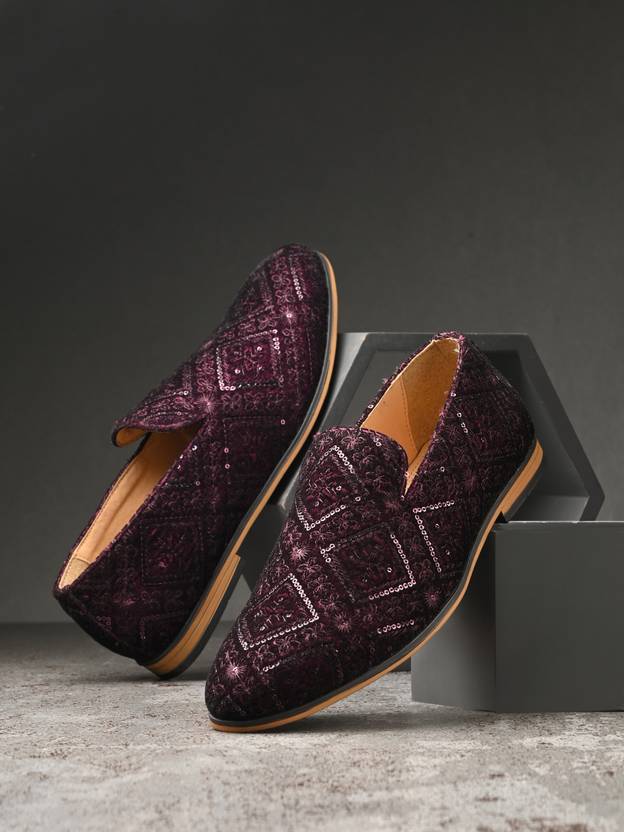 Men Bordo Casual Ethnic Velvet Embroidered Slip On Mojaris Shoes