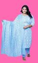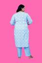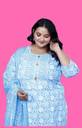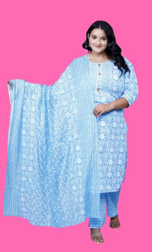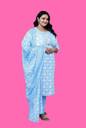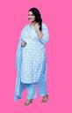 This elegant cotton kurta pant set features a beautiful Skyblue and white floral pattern. The kurta has three-quarter sleeves and a round neckline, complemented by matching pants and a flowing dupatta. Perfect for both casual and festive occasions, this outfit offers comfort and style
