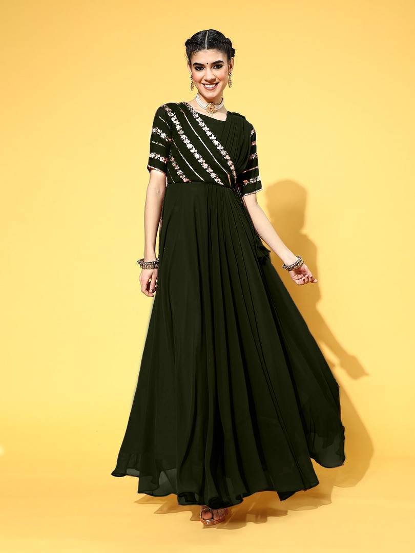 Step into elegance with our Georgette Fabric Gown, designed with a saree-inspired pattern that combines the best of both worlds. This exquisite gown boasts intricate embroidery on the yoke, sleeves, and back, adding a touch of sophistication to your attire. Crafted from lightweight and flowing georgette fabric, it offers comfort and style in one stunning package. Make a statement at any event with this gracefully designed gown.