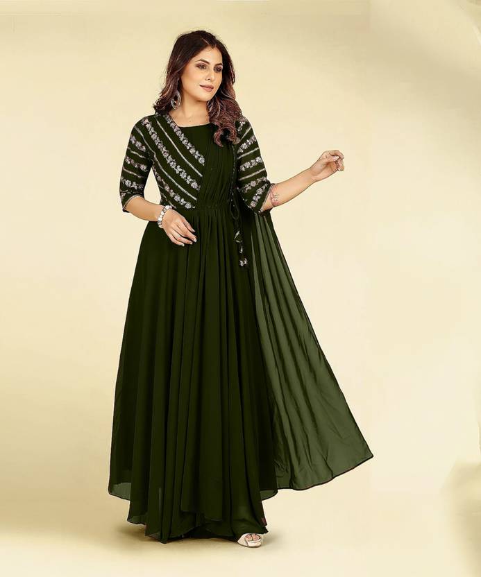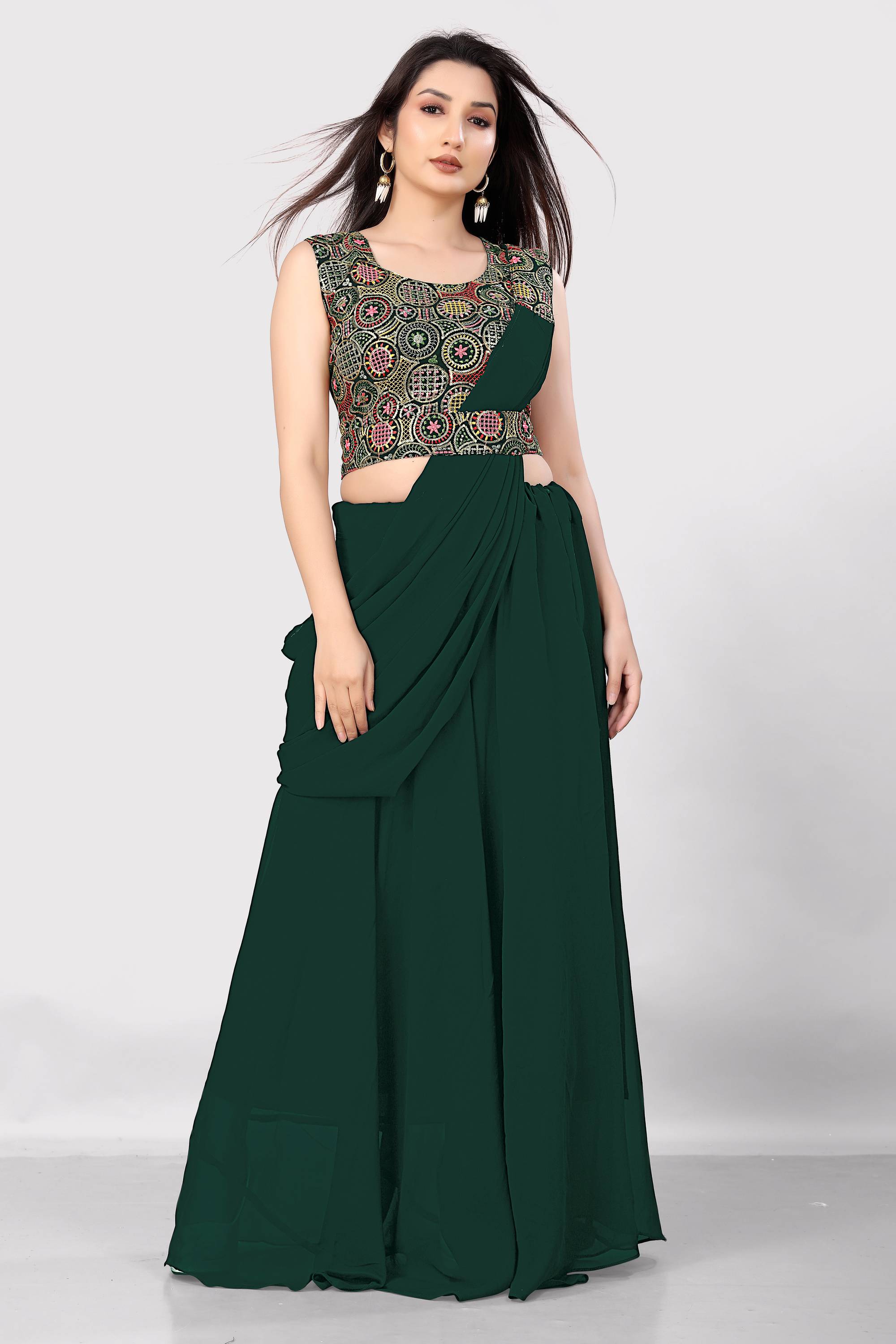 Step into elegance with our Georgette Fabric Gown, designed with a saree-inspired pattern that combines the best of both worlds. This exquisite gown boasts intricate embroidery on the yoke, sleeves, and back, adding a touch of sophistication to your attire. Crafted from lightweight and flowing georgette fabric, it offers comfort and style in one stunning package. Make a statement at any event with this gracefully designed gown.