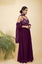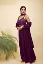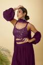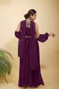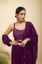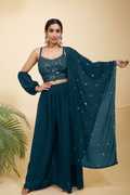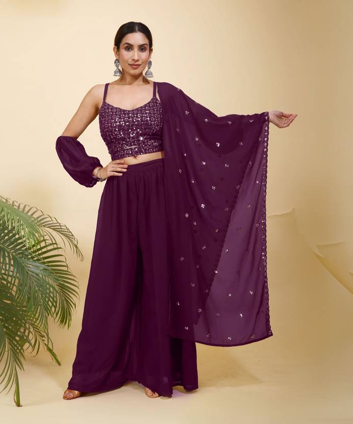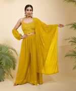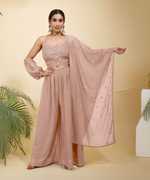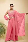 An elegant ethnic ensemble featuring a stylish top paired with a flowy palazzo. The outfit includes versatile detachable sleeves, allowing you to customize your look. It is complemented by a chic belt that enhances your waistline and a graceful dupatta, adding a traditional charm. Perfect for festive occasions or celebrations!