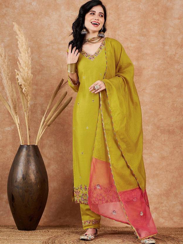 Women Embroidered Sequence Yellow Silk Blend Kurta with Pant and Dupatta Embroidered Kurta, Trouser/Pant & Dupatta Set