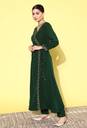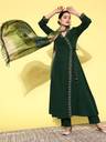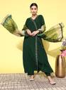 Elevate your party look with this stunning green embroidered Angrakha Kurta paired with comfortable trousers and a matching dupatta. The A-line floral embroidery and sequin detail add a touch of elegance, making it a perfect choice for any occasion.