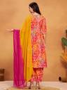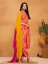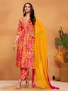 Kurta fabric-Rayon,Kurta length-Calf Length(46"Inch),Kurta Pattern - Floral Print,Kurta Style-Alia cut,Bottom fabric-Rayon,Bottom Type-Salwar,Dupatta Fabric-Poly Chiffon, Dupatta Length-2.50"inch