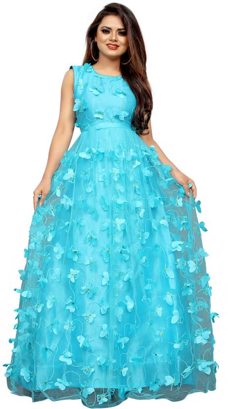 This Gown is Crafted with Butterfly over Net Fabric Having Embroidery Work on it. Gown is Comes With Inner Attached. Gown Color Firozi, Gown Length is 56 Inch. It has Sleeveless Gown. Gown is Semi-Stitched which can be fitted up to 42 inch Bust Size. Gown is Emblished with Fancy Butterfly. Dry Clean Or Normal Hand Wash. Product Color May Slightly Variation Due To Photographic Lighting Or Your Screen Settings And Other Accessories Are Only Modelling Purpose.