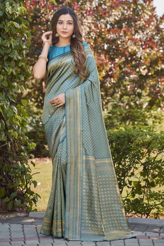 Firozi Colour Sari, Lightweight Banarasi Silk Saree, Jacquard Motif Design, All Occasions Saree