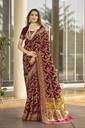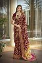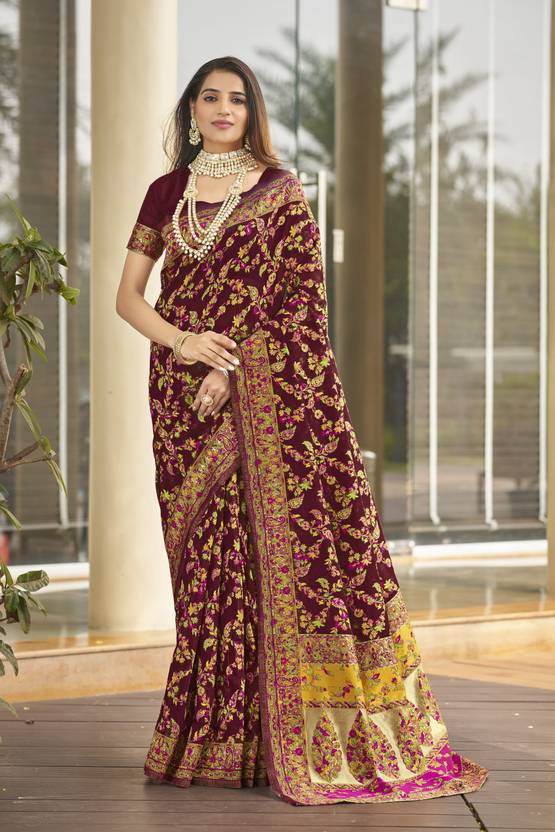 Step into the world of timeless elegance with our Banarasi Silk, Jacquard, and Kashmiri Pashmina Saree. This masterpiece combines opulent weaves to create a luxurious ensemble that is perfect for weddings and festivals. The colorful meenakari Jaal work, intricately designed, adds a burst of vibrancy and cultural significance to this saree.