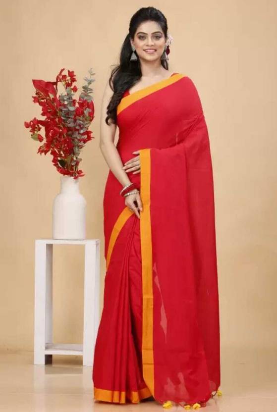 This handwoven saree is crafted from pure cotton, making it comfortable to wear all day long. The vibrant red color is perfect for any occasion, while the yellow border adds a touch of elegance. The saree is adorned with traditional running bp pleats at the bottom edge, adding to its charm.
