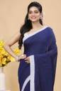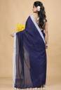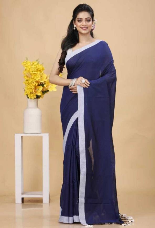 This handloom saree, crafted from pure cotton, is a timeless piece that exudes elegance and simplicity. The solid plain blue color is complemented by a delicate white border, creating a classic and understated look. The running bp adds a touch of sophistication, making it perfect for both formal and casual occasions.