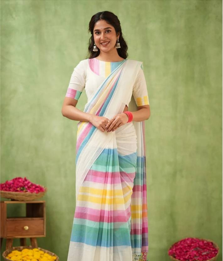 The saree features a rich black base enhanced with vibrant multicolor stripes on the pallu and borders, creating a stunning fusion of traditional style and modern appeal. Its soft drape and natural texture make it ideal for both casual daywear and festive occasions.