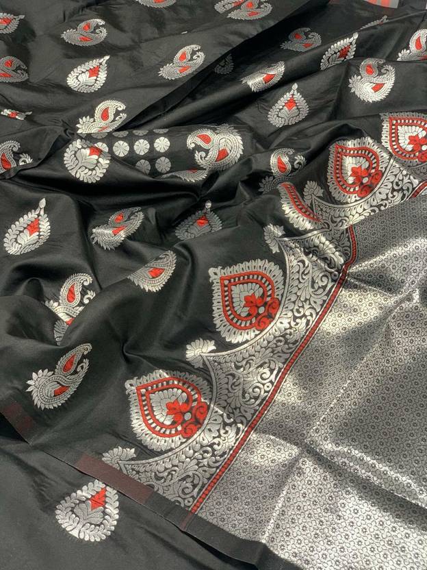 Woven Handloom Lycra Blend Saree (Orange, Black)