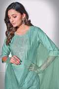 Sporting a silk blend kurta, silk pants, and a net dupatta with handwork, this set combines softness with structure. The silk blend fabric offers a fluid drape, while the net dupatta adds a delicate contrast with its detailed handwork. The combination of textures enhances the overall appeal, making the set suitable for extended wear without compromising elegance.