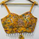The blouse is decorated with 3mm and 5mm sequins, detailed 8-needle embroidery, and finished with *Kodi Latkan* tassels and a delicate *spaghetti strap* pattern.