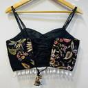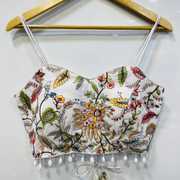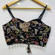 The blouse is decorated with 3mm and 5mm sequins, detailed 8-needle embroidery, and finished with *Kodi Latkan* tassels and a delicate *spaghetti strap* pattern.