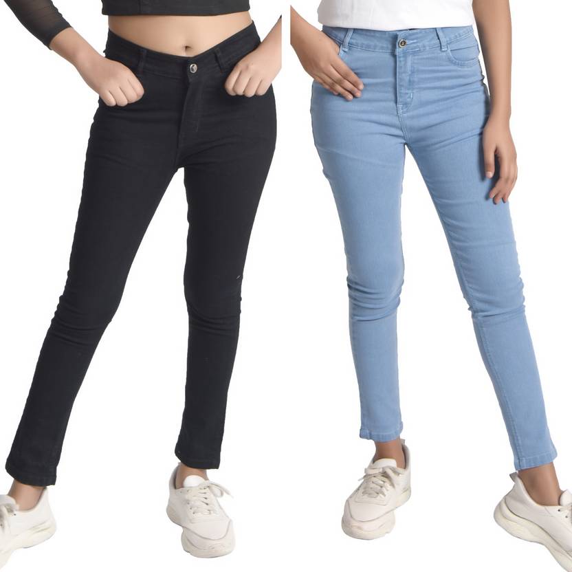 Women Skinny Mid Rise Black, Light Blue Jeans (Pack of 2)