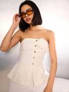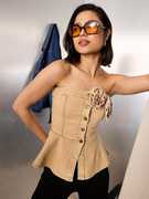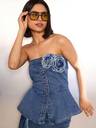 Blue Denim Washed Corsage Button Down Top, in Denim fabric, Unlined, Regular Length, Slim Fit, Button Closure, Flared Hemline and features Corsage Style