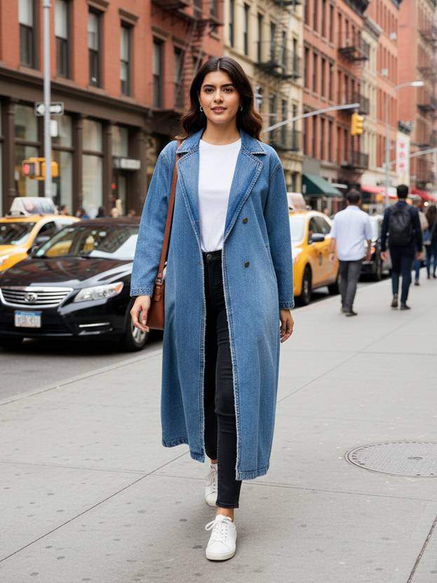 Blue Acid Washed Denim Over Coat, in Denim fabric, Unlined, Below Knee, Comfort Fit, Button Closure, Straight Hemline and features Belt Detail At Waist