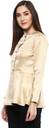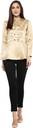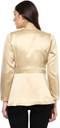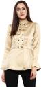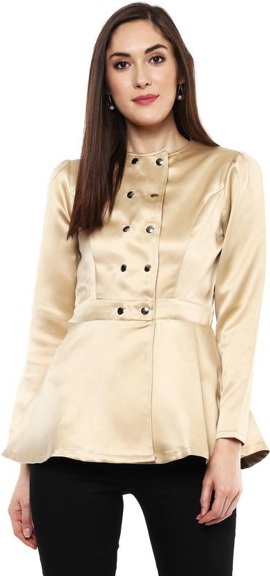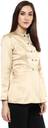 Beige Double Breasted Jacket with a Round Neck, in Polyester Satin fabric, Unlined, Long Sleeves, Hip Length, Fit and Flare, Button Closure, Curved Hemline and featuring a Double Breasted Placket