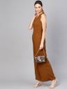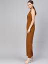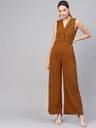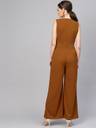 Brown Collared Flare Leg Jumpsuit, in Polyester Spandex fabric, Unlined, Full Length, Comfort Fit, Zipper Closure, Straight Hemline and features Side Tape With Golden Buttons At Waist