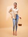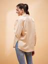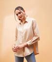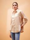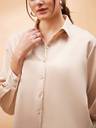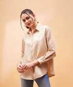 Beige Solid Satin Regular Shirt, in Satin fabric, Unlined, Regular Length, Comfort Fit, Button Closure, Curved Hemline and features Cuff Detail At Sleeve