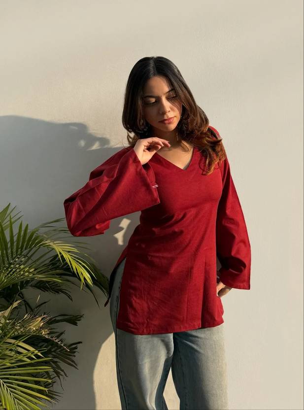This comfortable maroon top features stylish bell sleeves and a flattering V-neck, crafted from 100% pure rayon for a soft feel. Its fade-resistant color and refined stitching ensure lasting quality. Perfect for a casual yet chic look, this versatile top can be paired effortlessly with jeans, trousers, or skirts.