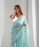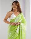 Explore the collection of beautifully designed sarees from Satrani Sarees. Saree Fabric : Shimmer Chiffon & Blouse Fabric : Satin :: Saree Color : Parrot Green & Blouse Color : White :: Saree Work :Sequins Embroidery & Blouse Work : Solid