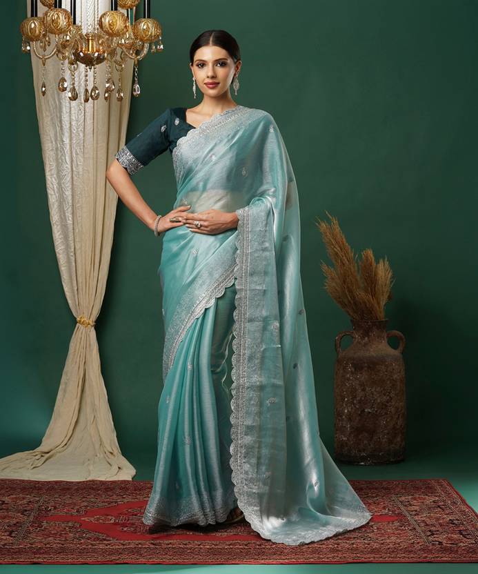 Discover A Stunning Assortment Of Beautifully Crafted Sarees At Satrani Sarees.Saree Fabric : Tissue Silk & Blouse Fabric : Bhagalpuri Silk :: Saree Color : Sky Blue & Blouse Color : Dark Rama Blue, Silver :: Saree Work : Sequence Embroidery, Scalloped Border & Blouse Work : Sequence Embroidery, Dyed :: Saree Length : 5.50Mtr & 0.80Mtr