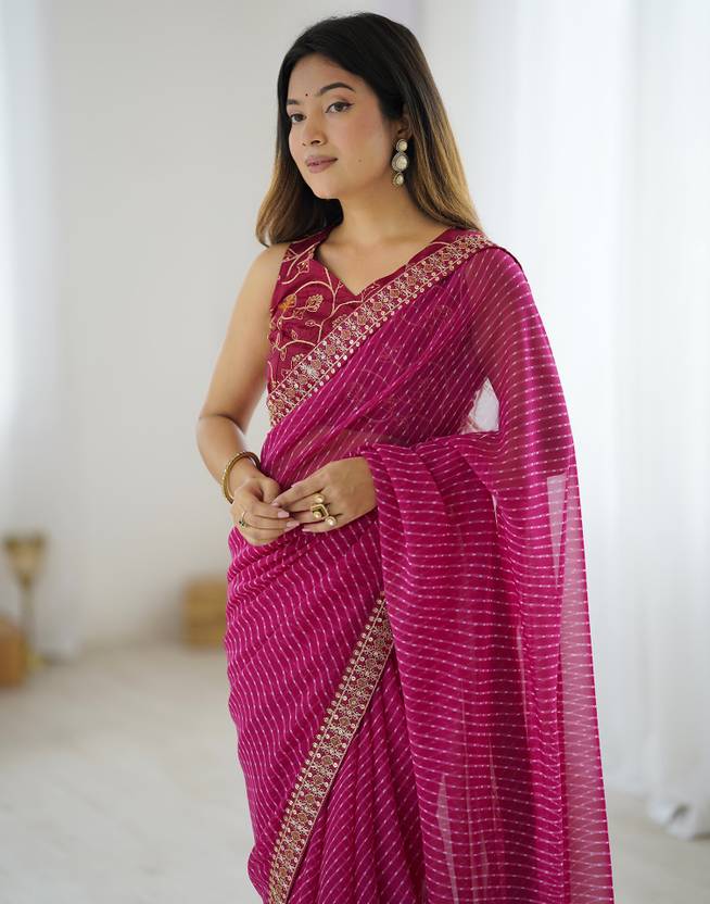 Explore the collection of beautifully designed sarees from Satrani Sarees. Saree Fabric : Georgette & Blouse Fabric : Art Silk :: Saree Color : Rani Pink & Blouse Color : Rani Pink :: Saree Work :Laheriya Printed,Embroidery Lace Border & Blouse Work : Dyed, Sequence Embroidery