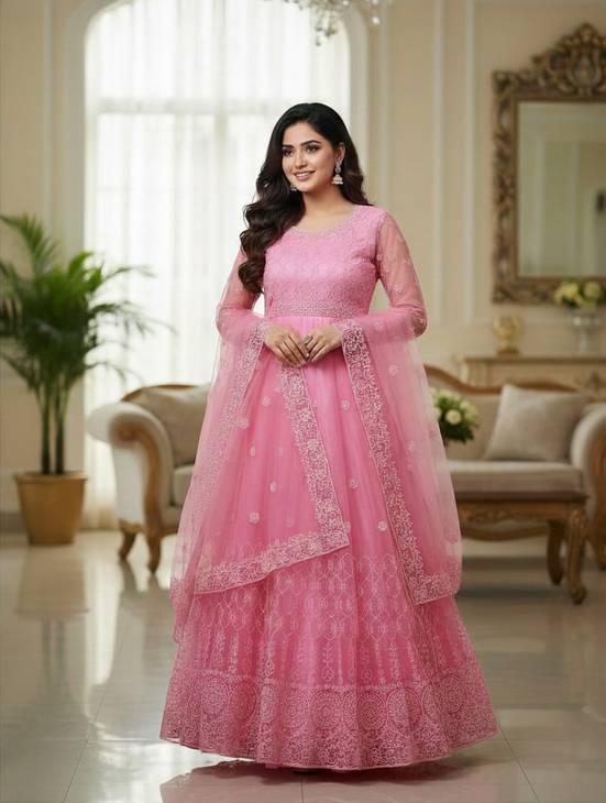 Color : Pink, Introducing our Women's Net Embroidered Semi-Stitched Gown.The modern woman who appreciates tradition and style will find her ideal match in our Women's Net Embroidered Semi-Stitched Gown. You will look and feel your best on your wedding day thanks to the special quality and to detail that have gone into each piece.Gown is Comes With Inner and Dupatta Available 2.20 Meter.Gown Length is 57 Inch. It has Full Sleeves with Embroidered Work. Gown is Semi-Stitched which can be fitted up to 44 inch Bust Size. Dry Clean Or Normal Hand Wash.